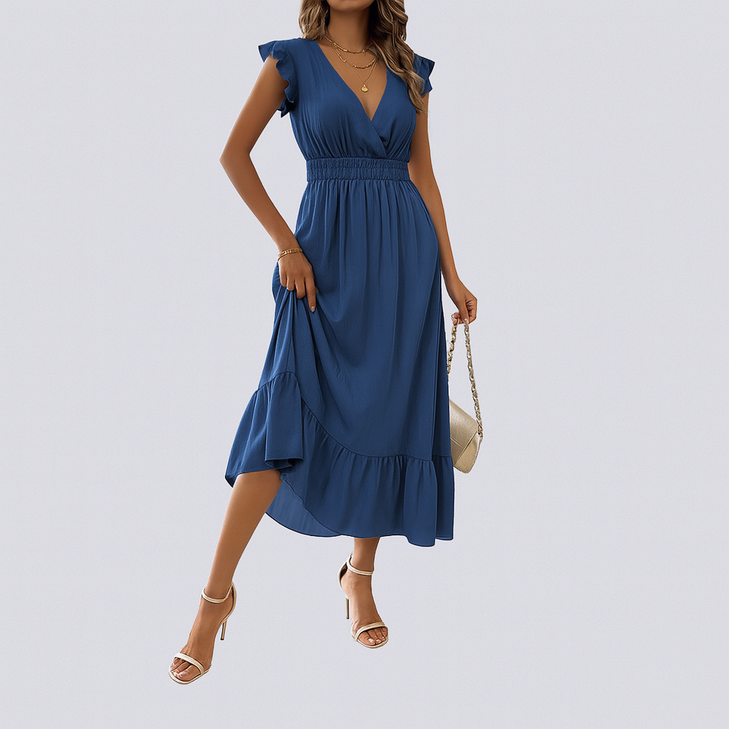 Designed to flatter, the Isabella™ Midi Dress features a smocked waist that gently defines your shape, complemented by soft ruffle sleeves for a touch of romance. With its wrap-style bodice and flowing tiered hem, this dress moves beautifully with you—perfect for garden parties, brunch dates, or evening get-togethers.